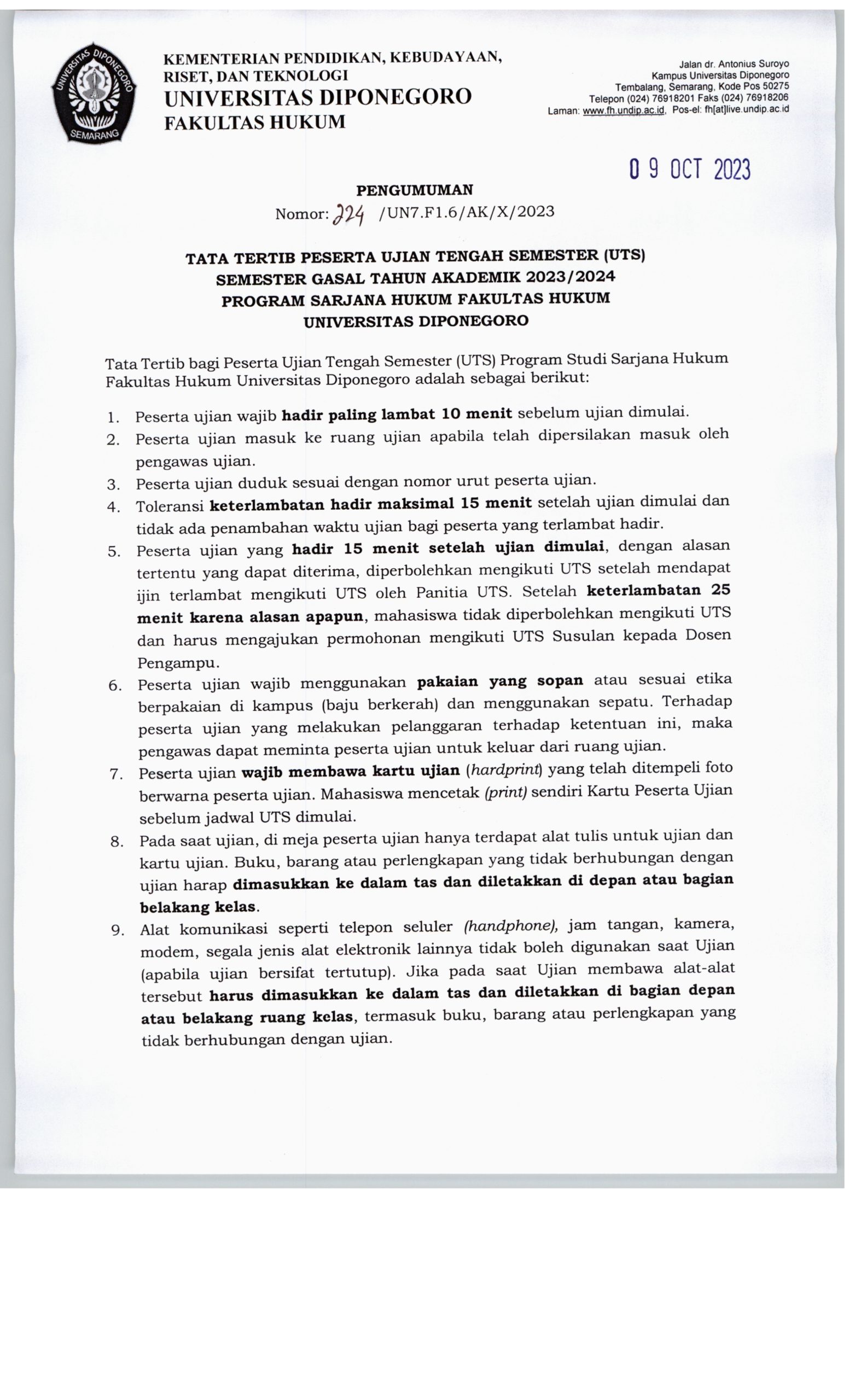 Diberitahukan kepada mahasiswa Program Studi Sarjana Hukum Fakultas Hukum Universitas Diponegoro untuk memperhatikan tata tertib selama ujian UTS berlangsung , sesuai dengan surat edaran berikut :