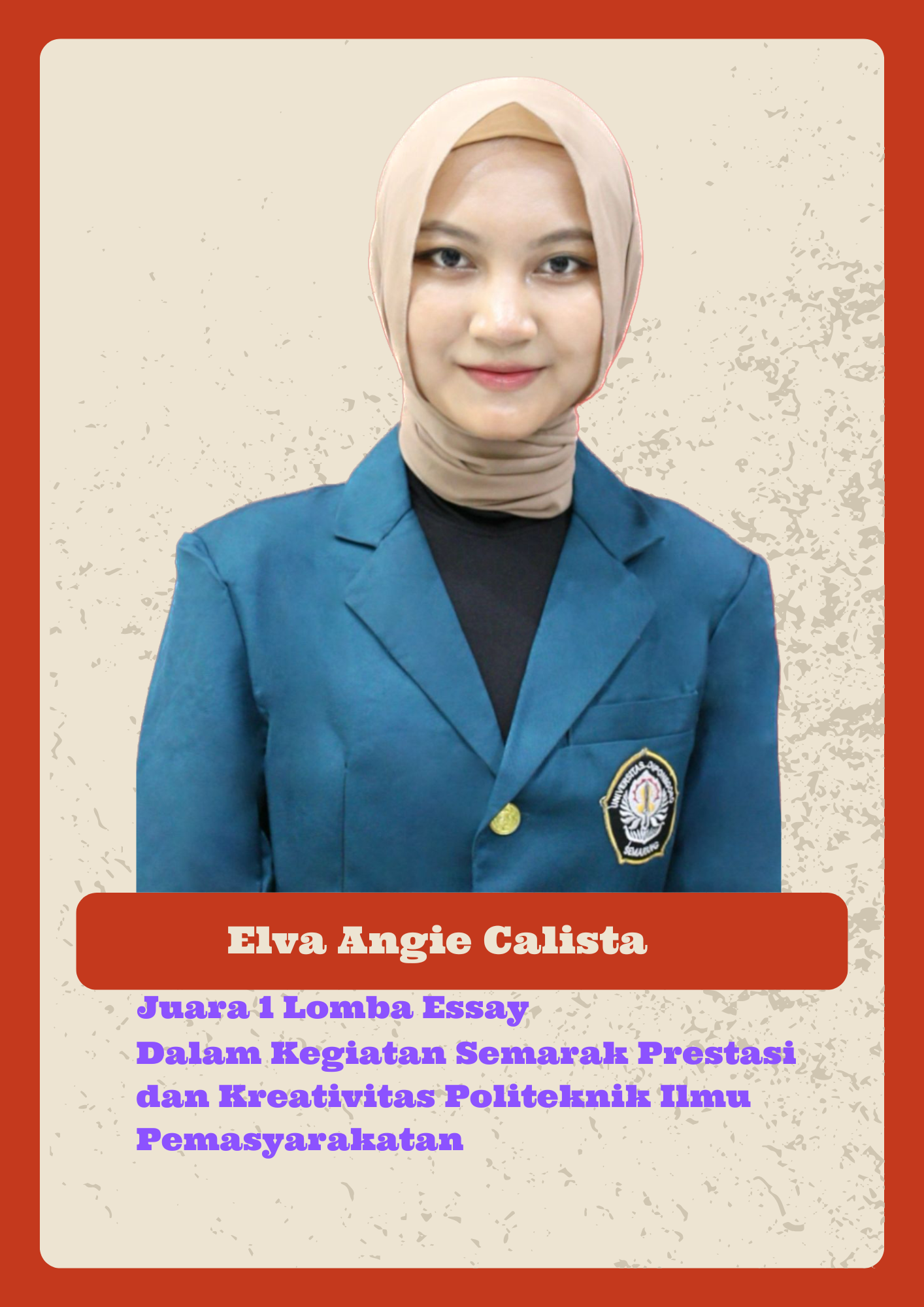 Semarang, 21 Januari 2025 – Prestasi membanggakan kembali diraih oleh mahasiswa Fakultas Hukum Universitas Diponegoro. Elva Angie Calista, mahasiswa Fakultas Hukum angkatan 2023, berhasil meraih juara 1 dalam lomba esai bertajuk SEMARAK PRESTASI DAN KREATIVITAS POLITEKNIK ILMU PEMASYARAKATAN yang diselenggarakan secara daring oleh Politeknik Ilmu Pemasyarakatan.