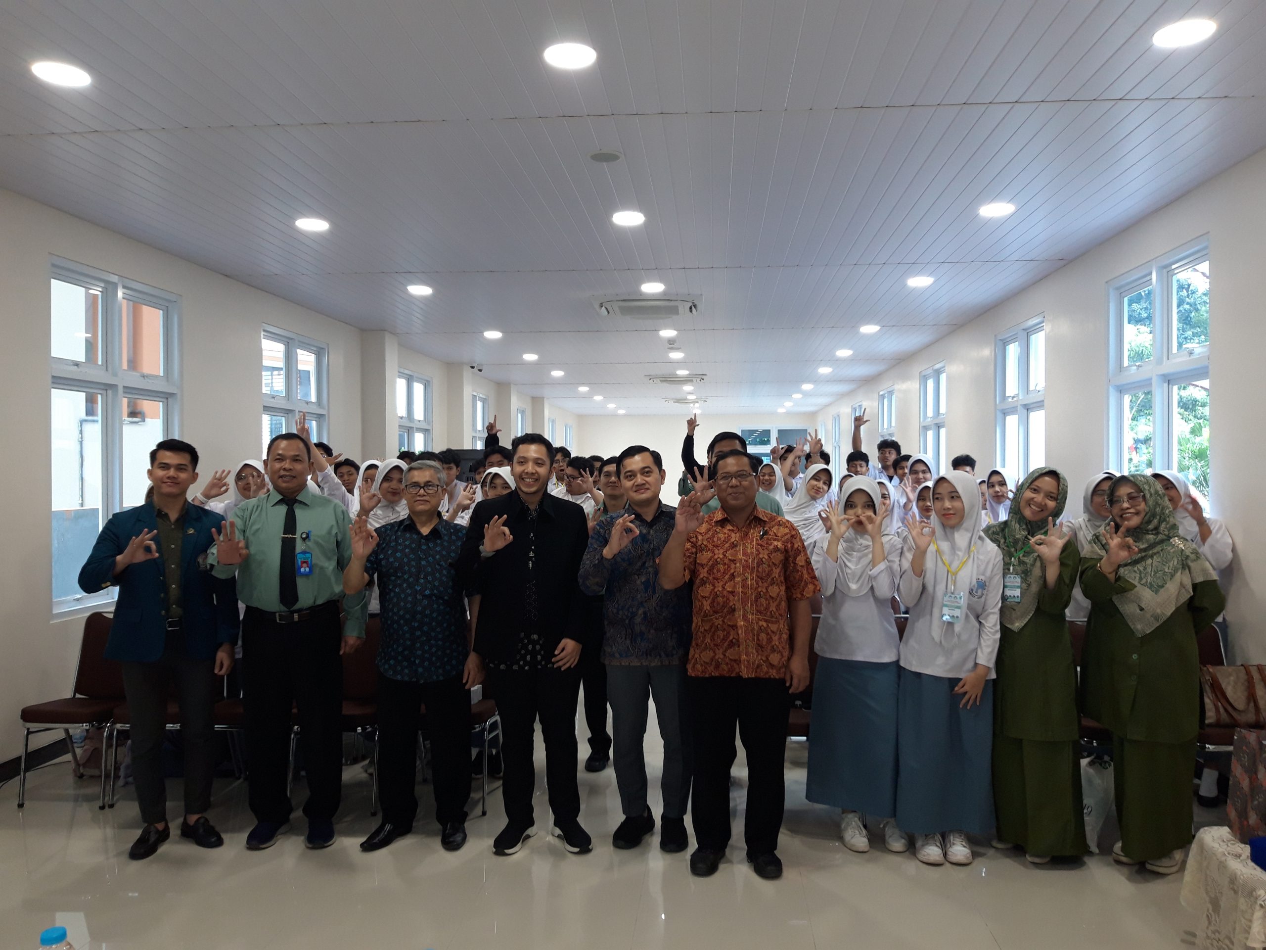 The event continued with the handover of a plaque as a sign of appreciation between FH Undip and SMA Islam Al Azhar 19. Followed by a group photo. Then enter the core of the event, namely the presentation of the Overview of the Introduction to the Academic System of FH Undip by Dr. Adity Yuli Sulistyawan, S.H., M.H. and sharing sessions with undergraduate students of FH Undip Sdr Rizqi Andhika Candra A and Sdri Tesa Tresnawati.